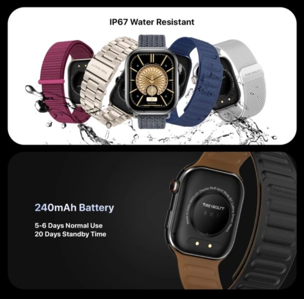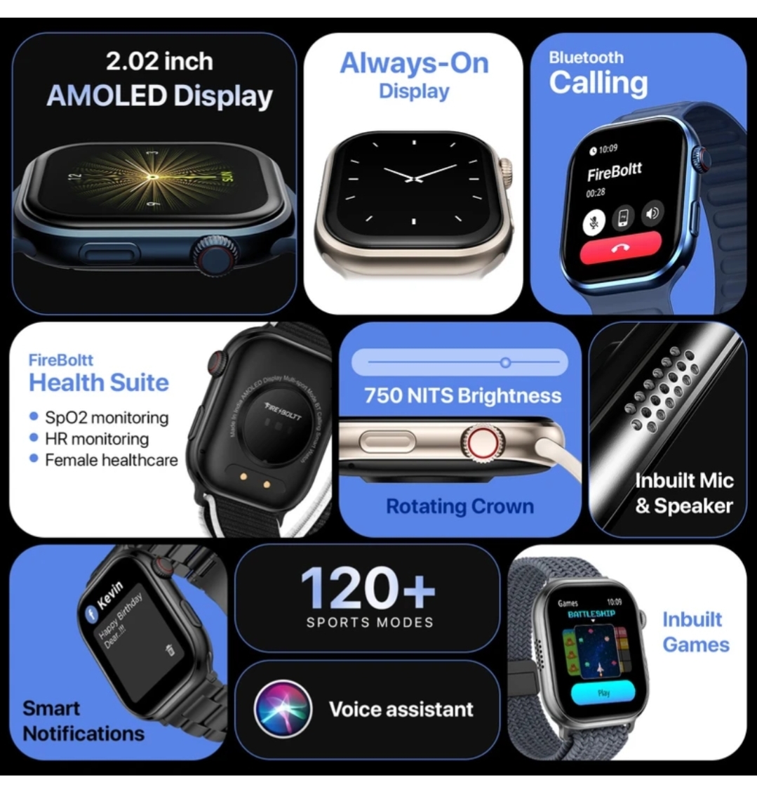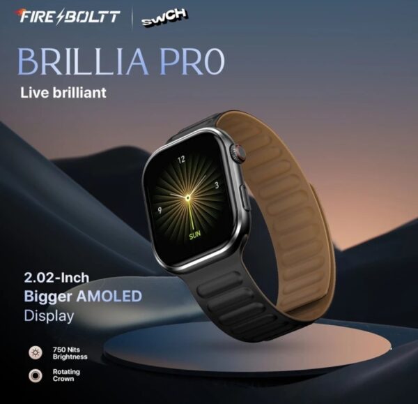 Introducing Fire-Boltt Brillia Pro Smartwatch: a 51.3mm always-on AMOLED marvel boasting 750 NITS brightness for crystal-clear visuals. Stay connected with Bluetooth calling and a responsive voice assistant. Prioritize your health with a comprehensive suite featuring SpO2, heart rate monitoring, and female healthcare. With over 120 sports modes, IP67 durability, and a robust battery life, it’s built for an active lifestyle. Enjoy smart notifications, fun games, customizable watch faces, and sedentary alerts, making it the ultimate all-in-one companion for your wrist.