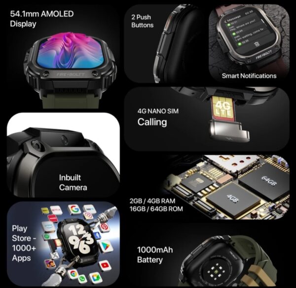 Fire-Boltt Clickk 54.1mm (2.12 inch) AMOLED Display, Front Camera, Nano SIM Slot, 1000mAh Smartwatch 2GB RAM/16ROM