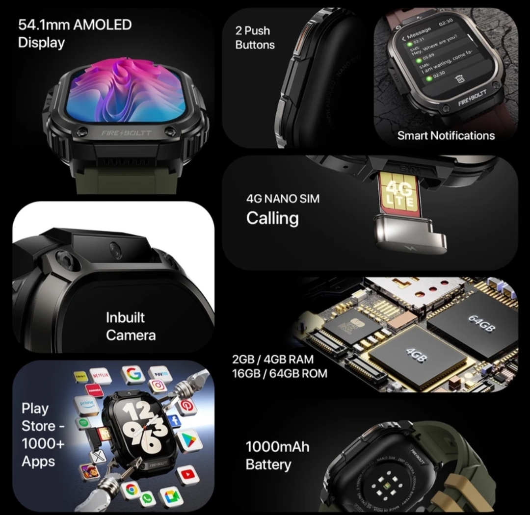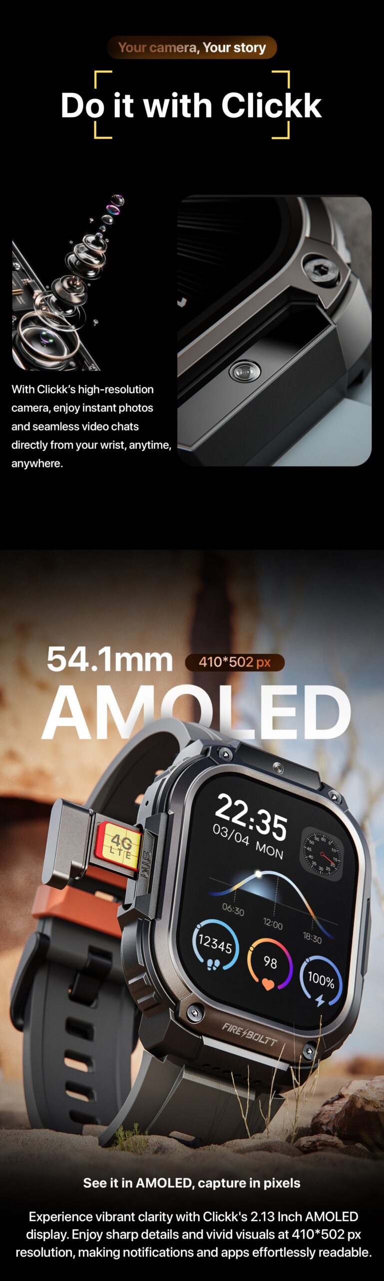 The Fire-Boltt Clickk is a feature-packed smartwatch designed for users who want smartphone-like functionality on their wrist. It comes with a large 54.1mm (2.12-inch) AMOLED display, delivering vibrant colors and sharp visuals that make navigation, media, and notifications look stunning. The watch supports a Nano SIM slot and 4G/VoLTE calling, allowing users to make and receive calls, send messages, and stay connected even without a phone.