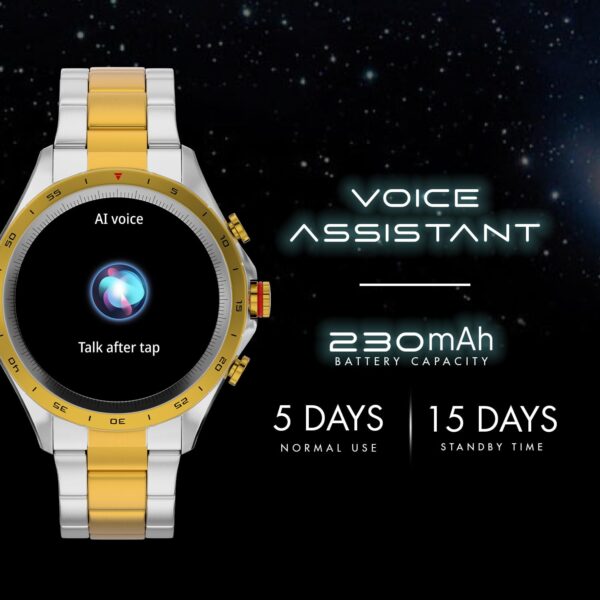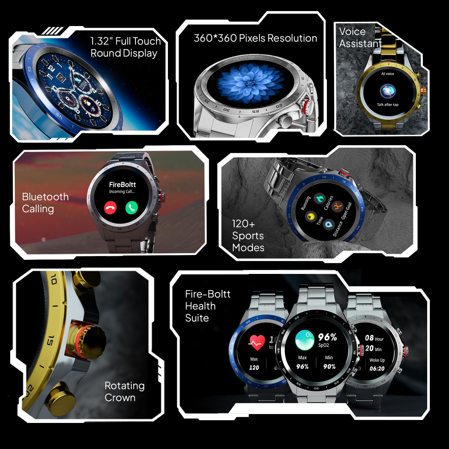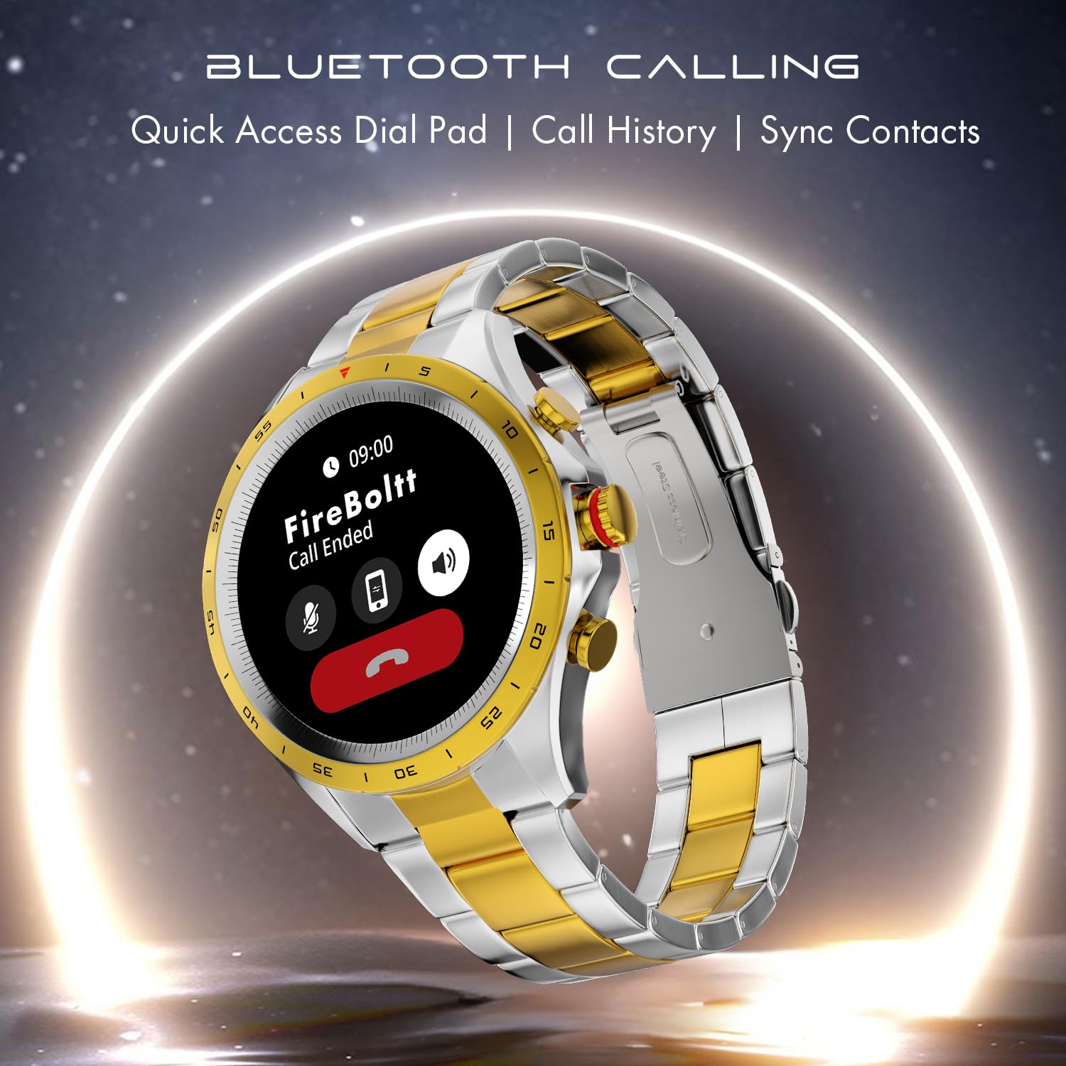 Fire-Boltt Solace Luxury Stainless Steel Smart Watch, 33.52mm (1.32 inch) (33.5mm) Display 360 * 360 px high Resolution with 60Hz Refresh Rate, Bluetooth Calling & 360 Health Monitoring (Gold Silver)