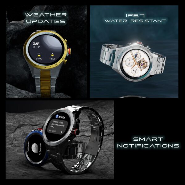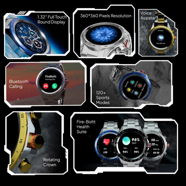 Special Feature Accelerometer, Activity Tracker, Alarm Clock, Calorie Tracker, Camera, Notifications, Pedometer, Phone Call, Sedentary Reminder, Sleep Monitor, Text message, Time Display, Spo2 (Blood Oxygen Monitoring), Heart Rate Tracking, Bluetooth Calling, IP67 Smartwatch, 1.32″ Round Display, 360*360 Px Resolution, Built In Mic & Speaker, Voice Assistant, Find Phone, Daily Workout Memory, Distance Tracker, Multisport Tracker, Music Player