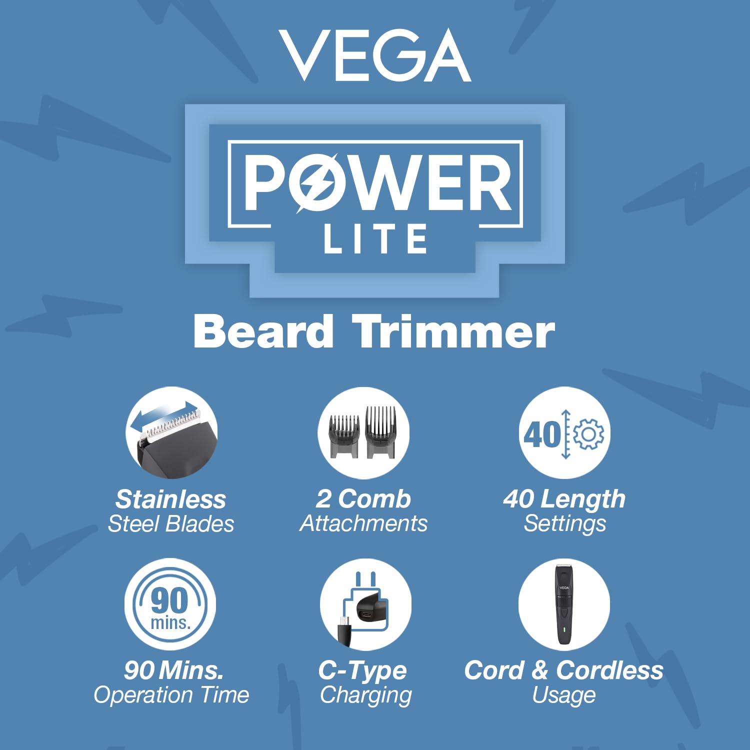 • Ergonomic Design: The Vega Power Lite Beard Trimmer offers better grip for comfortable trimming.